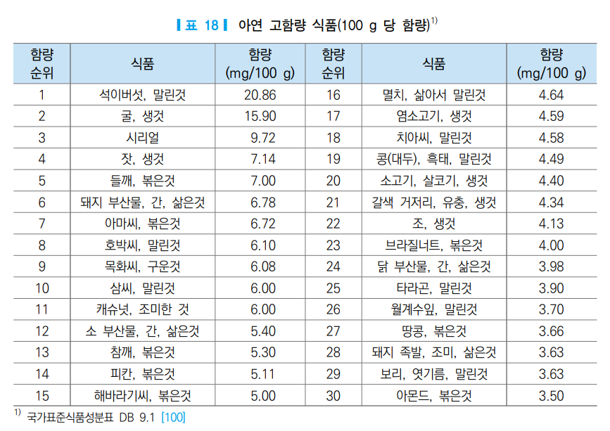 3. 아연 급원 식품 / 고함량 식품